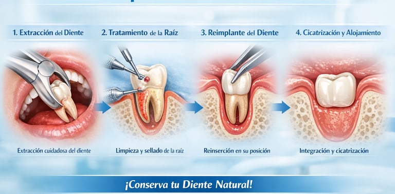 El reimplante intencional es un procedimiento especializado en odontología que consiste en extraer cuidadosamente un diente, tratarlo fuera de la boca y volver a colocarlo en su posición original dentro del alveolo (hueso donde se encuentra el diente).